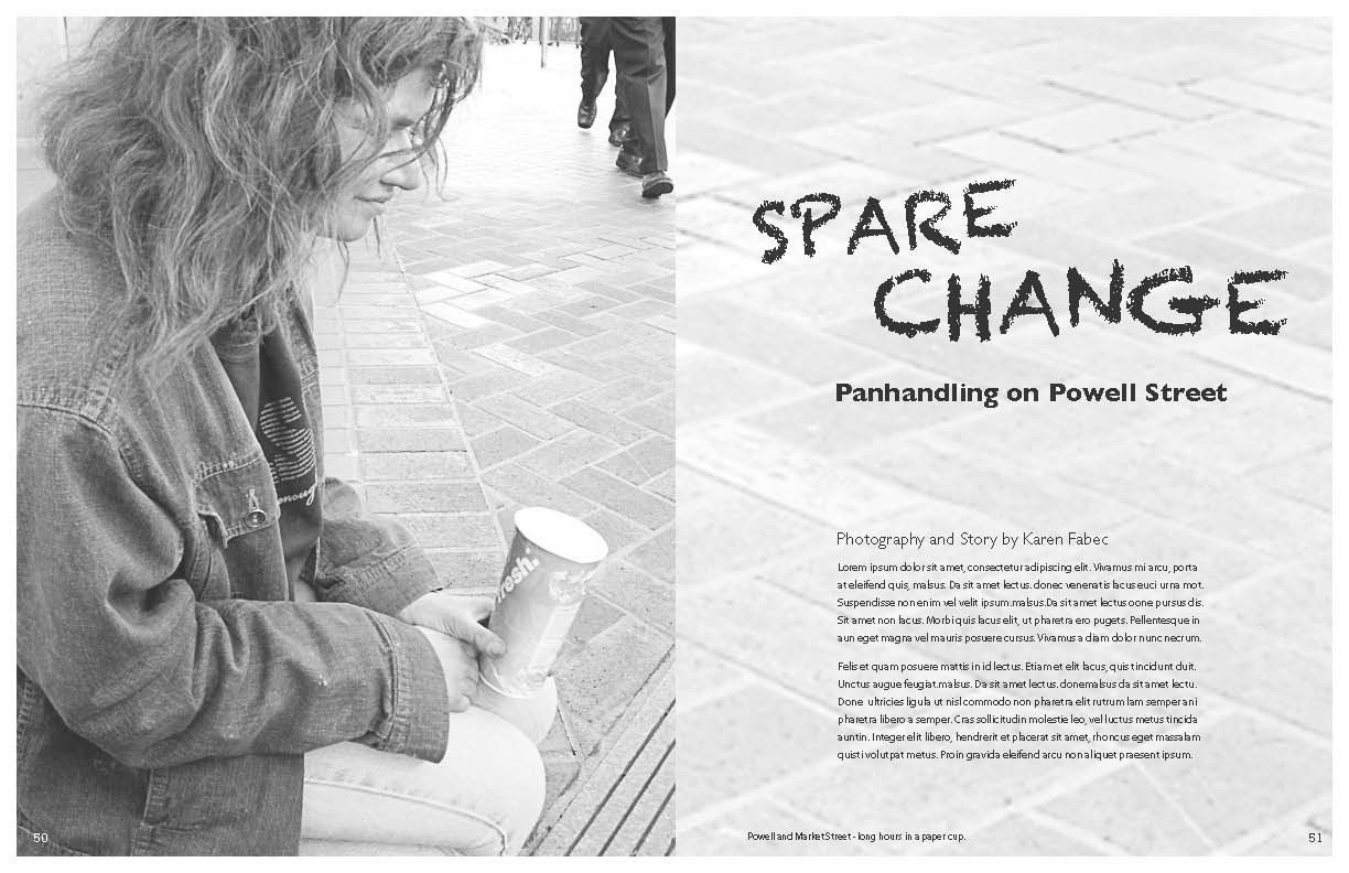 “Spare Change” Article spread : photography, layout, digital typesetting.